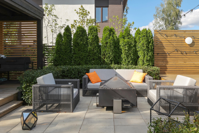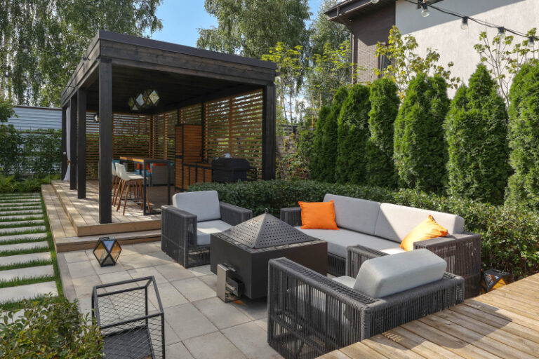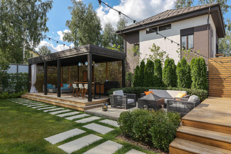 Монохромное озеленение сочетает строгие линии туй и пышные кроны деревьев