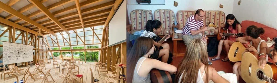 - Ролевые пространства — зоны, имитирующие магазинчик, отель, кухню, ресторан, театр, школу с меловой доской